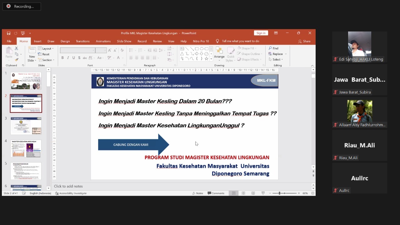 Jumat 1 April 2022 Program Studi Magister Kesehatan Lingkungan Kesehatan Lingkungan mengadakan kegiatan Promosi Mahasiswa Baru dengan HAKLI secara daring dengan media zoom yang dihadiri sejumlah 40 calon mahasiswa . Acara diawali dengan pembukaan dan paparan oleh Ketua Prodi Magister Kesehatan Lingkungan FKM Undip Dr. Ir. Mursid Raharjo, M.Si . Dalam paparanya beliau menjelaskan ada 3 program pendidikan pada Prodi Magister Kesehatan Lingkungan FKM Undip diantaranya :