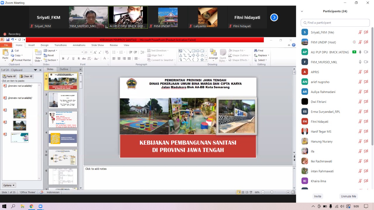 Rabu 23 Maret 2022 Program Studi Magister Kesehatan Lingkungan Kesehatan Lingkungan FKM UNDIP telah mengadakan kegiatan “ Kuliah Umum Dosen Tamu dengan topik Strategi Pencapaian Akses Layak Air Minum dan Sanitasi Bagi Masyarakat Jawa Tengah Melalui Pembangunan SPAM Regional dan IPLT Regional “. Kegiatan tersebut diadakan secara daring menggunakan zoom meeting dan diikuti oleh sekitar 19 mahasiswa . Materi disampaikan oleh Dr. Muhammad Ali ,ST, Mt. dari Dinas Pekerjaan Umum Bina Marga dan Cipta Karya Provinsi Jawa Tengah.