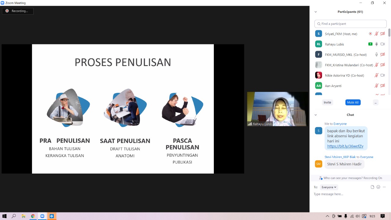 Pada Tanggal 19 Maret 2022 Program studi Magister Kesehatan Lingkungan mengadakan Pelatihan Penulisan Artikel dan Pemilihan Jurnal untuk publikasi mahasiswa secara online via zoom meeting yang menghadirkan narasumber dr. Rahayu Lubis , M. Kes, Ph. D dari Fakultas Kesehatan Masyarakat Universitas Sumatra Utara.