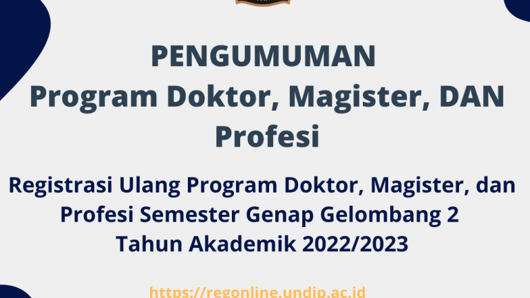 | PENGUMUMAN REGISTRASI DAN VERIFIKASI PROGRAM DOKTOR, MAGISTER, DAN PROFESI SEMESTER GENAP GELOMBANG 2 TA 2022/2023(registrasi online mulai tanggal 26 Januari 2023 s.d. 3 Februari 2023 pada laman https://regonline.undip.ac.id/) | |