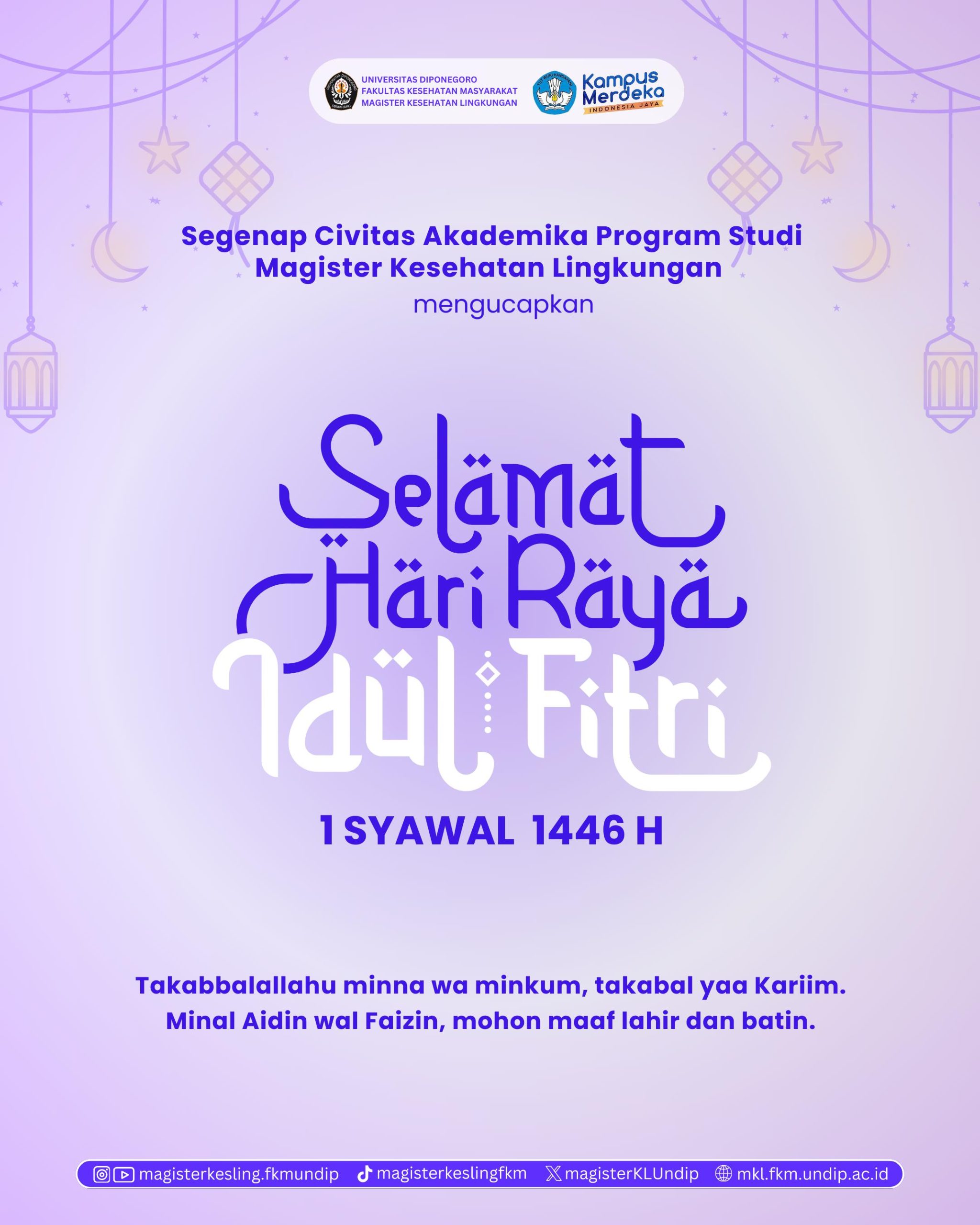 Segenap Civitas akademik Program Studi Magister Kesehatan Lingkungan mengucapkan Selamat Hari Raya Idul Fitri 1 Syawal 1446 H , Takabbalallahu minna wa minkum, takabal yaa kariim minal aidin walfaidin , mohon maaf lahir dan batin 🙏