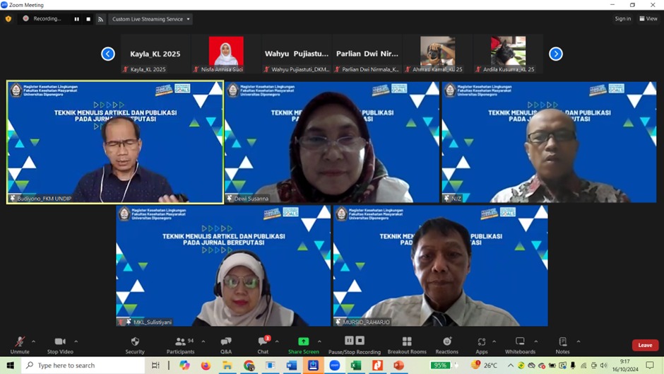 Kegiatan seminar pendidikan ini dilaksanakan pada tanggal 16 oktober 2024 secara daring via zoom meeting dengan menghadirkan narasumber Prof. Dr. Dra. Dewi Susana, M.S dari Universitas Indonesia, moderator Dr. Nurjazuli, SKM, M. Kes dihadiri para mahasiswa dan dosen dengan tema “Teknik Menulis Artikel dan Publikasi Pada Jurnal Bereputasi.